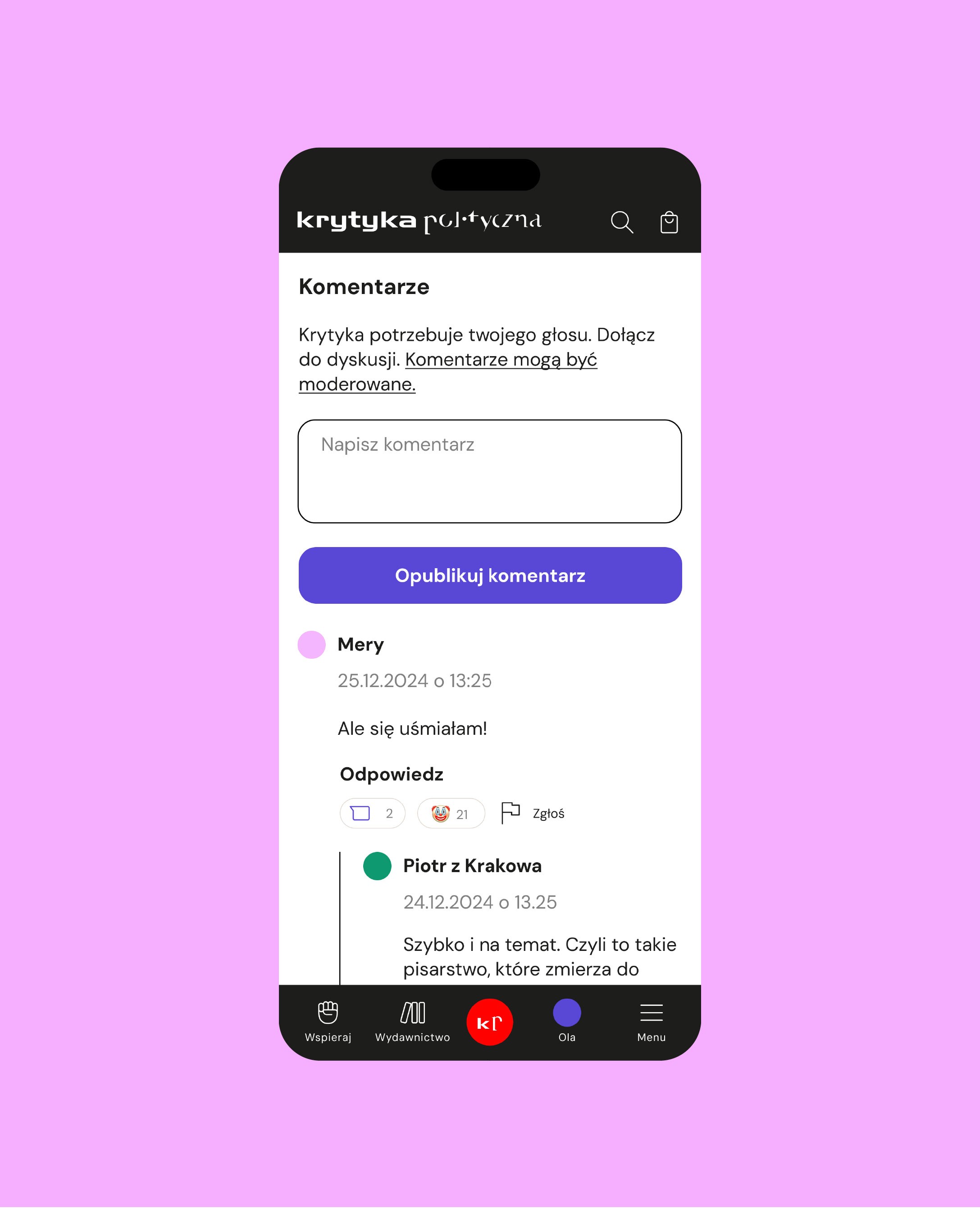 Zaprojektowaliśmy kompleksowy design system z mobile-first architekturą, wyrazistą kolorystyką i modularnymi komponentami działającymi spójnie dla wszystkich pięciu działów. Kluczem były funkcjonalności budujące społeczność: system śledzenia ulubionych autorek i tematów, komentarze, dyskusje i spersonalizowane rekomendacje treści. Stworzyliśmy jedno konto użytkownika integrujące dostęp do dziennikarstwa, księgarni i wydarzeń, własne CRM z automatyzacją marketingową oraz zintegrowaną bramkę płatniczą.