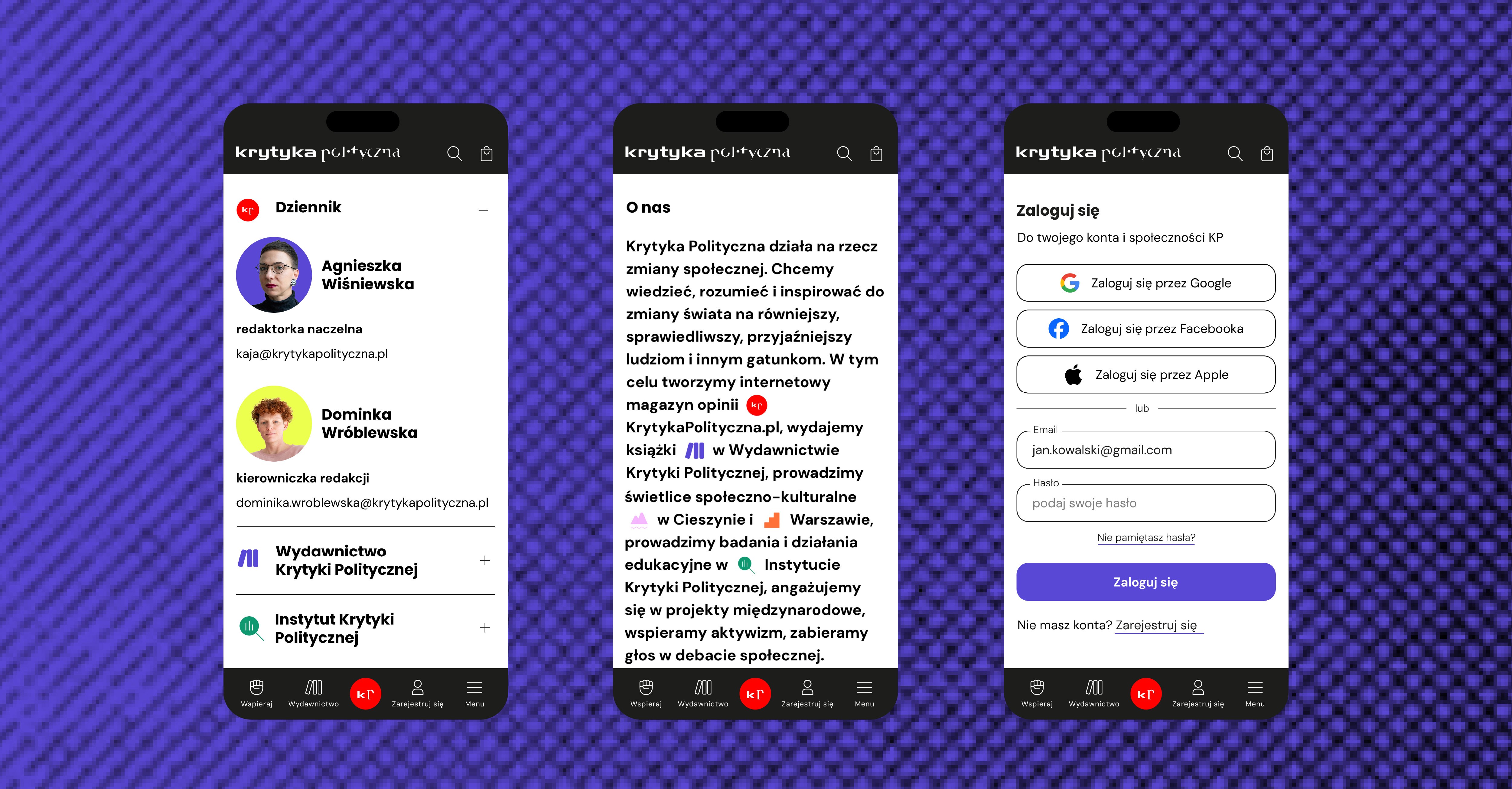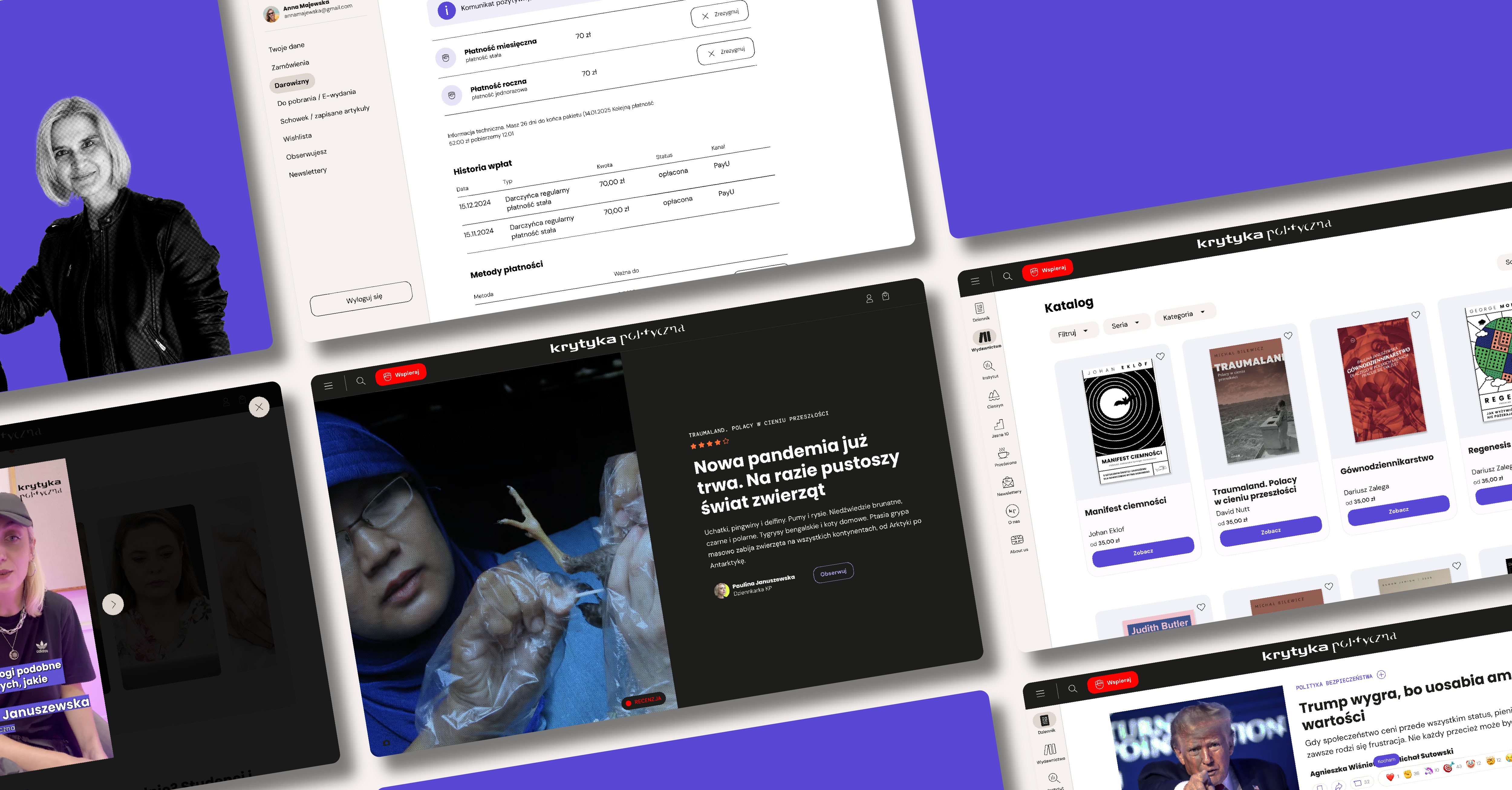 Krytyka Polityczna działała w pięciu obszarach – dziennikarstwo, wydawnictwo, badania, fundraising i edukacja – każdy z własnymi narzędziami, celami i użytkownikami. Rozproszona infrastruktura oznaczała chaotyczną nawigację, brak spójnej tożsamości wizualnej i niemożność zbudowania prawdziwej społeczności. Użytkownicy gubili się między działami, nie mogąc łatwo przejść od artykułu do książki czy wydarzenia.